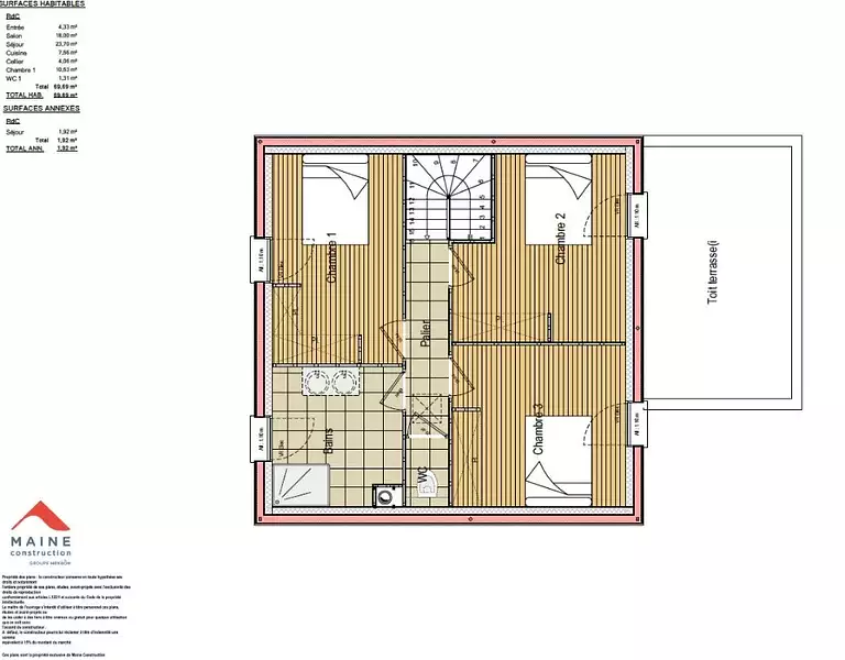 Terrain proposé par un partenaire foncier selon disponibilités et autorisation de publicité au prix de 69 900 €. Hors droit d'enregistrement et frais de notaire. Terrain + Maison proposés au prix de 185 100 € (Hors branchements et raccordements, papiers peints, peintures, revêtement de sol dans les chambres. Tarif modifiable sans préavis). Etiquette énergie : A. Différents modèles disponibles pour ce terrain. Assurances et garanties du constructeur (RC professionnelle, décennale, dommage ouvrage, garantie de remboursement de l'acompte, livraison à prix et délai convenu) : https://www.maine-construction.fr/mentions-legales/. HEXAOM Services est enregistré auprès de l'ORIAS en tant que Courtier en financement, Niveau 1, sous le numéro 14001345.
