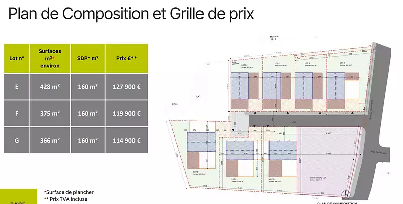 Autre lot disponible de 375 m2 à 428 m2 et de 119 900€ à 127 900 €.
