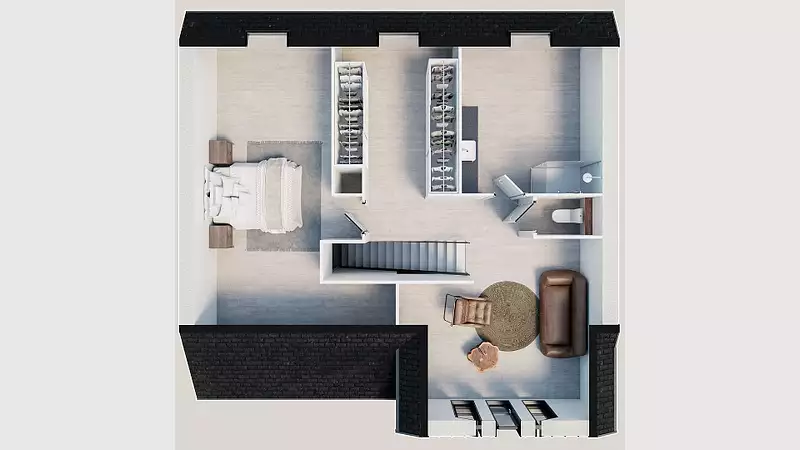 La distribution des pièces intérieures s'articule sur 3 niveaux autour de l'escalier central de style New Yorkais.