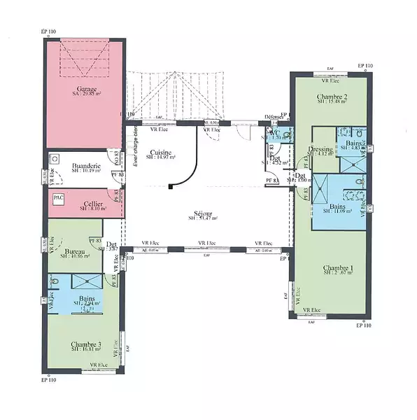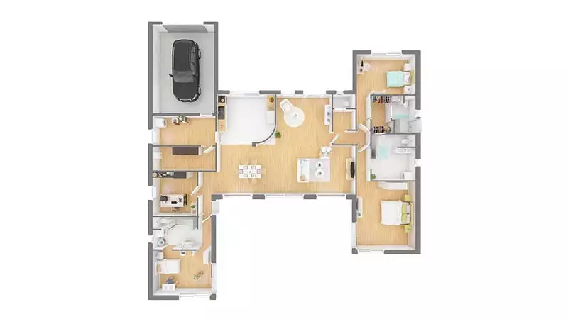 L’Esthetium, c'est un mélange des genres pour une vie coquette. Cette maison se décompose en trois parties distinctes. D'un côté, vous trouverez le garage intégré, idéal pour protéger votre véhicule et offrir un espace de rangement supplémentaire. Au centre, la spacieuse pièce de vie séjour-cuisine ouverte, avec cellier et entrée, vous invite à partager des moments conviviaux en famille ou entre amis. Enfin, le coin nuit, composé de trois chambres autour d’un dégagement, vous assure confort et intimité. Une quatrième pièce, polyvalente, peut servir de bureau, de salle de jeux ou de chambre d'appoint.