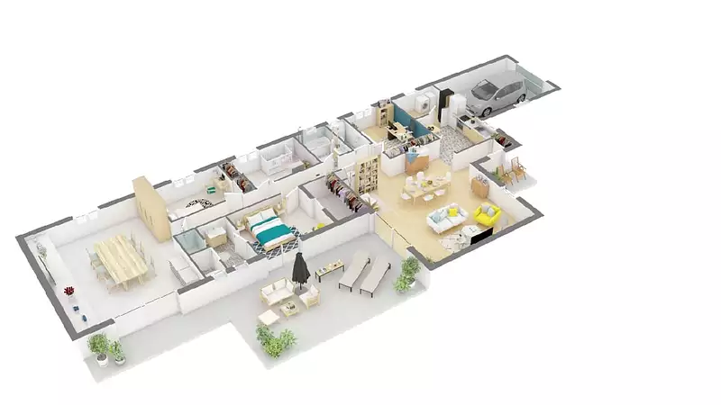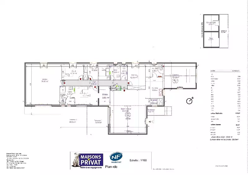 La maison Lherbaudière se distingue par son agencement pratique et fonctionnel. De plain-pied, elle s'étend en longueur avec un garage accolé à une extrémité et un généreux atelier à l'autre, pouvant être aménagé en studio indépendant. Entre ces deux espaces se trouve la surface habitable de 180 m².