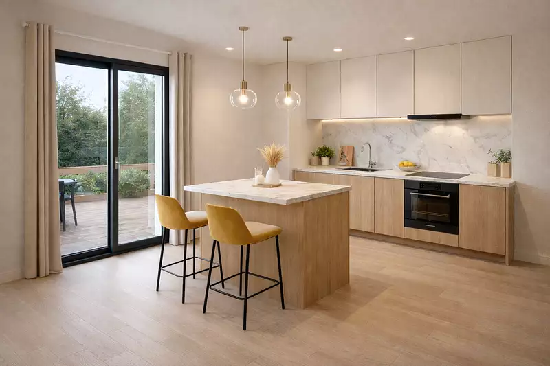 - une cuisine ouverte avec îlot central, moderne et fonctionnelle.