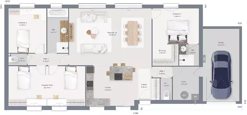 Paris à 20 min (RER A) - À découvrir à Lognes (77185) : maison neuve 5 pièces à vendre. Surface de 120 m² sur 320 m² de terrain. Conçue de plain-pied, elle offre quatre chambres, une cuisine et deux salles de bains.