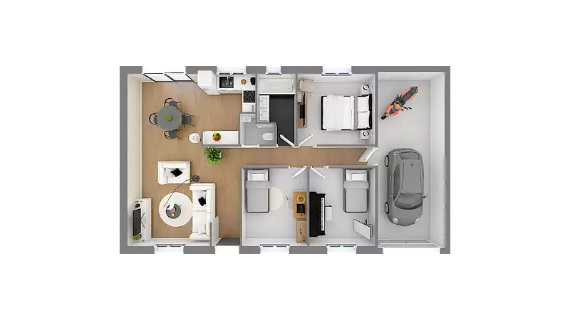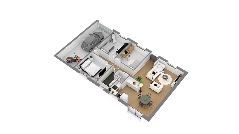 Plain pied de 72 m² habitable comprenant une cuisine ouverte sur un grand séjour, 3 chambres , 1 salle de bain, un wc, un cellier et un garage.
