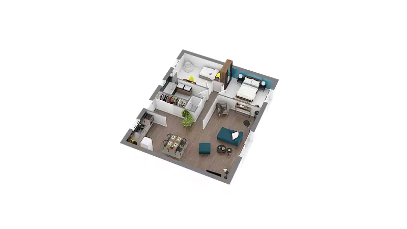 Plain pied de 75 m² habitables comprenant une cuisine ouverte sur un grand séjour, 2 chambres , 1 salle de bain et un wc.