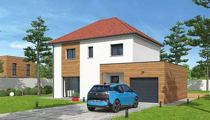 Le modèle présenté ici est la NATILINE, une maison de 93 m² habitables à étage, avec un garage accolé de 17 m². Son design s'inspire des bastides du Sud, avec une distribution intérieure fluide et chaleureuse.