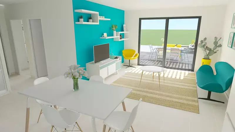 Maison de 64m² avec 2 chambres et une belle pièce de vie avec cuisine ouverte.
