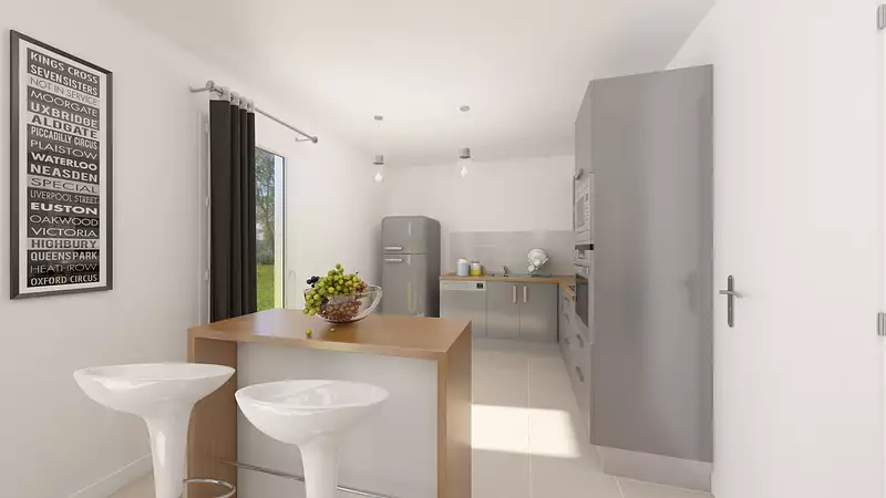 Vous serez séduits par cette maison contemporaine qui se distingue par son porche en façade et ses enduits bi-ton personnalisable. Elle vous accueille dans un très bel espace de vie de plus de 44 m² très lumineux grâce à ses nombreuses ouvertures. La cuisine ouverte est très fonctionnelle puisqu’à la fois ouverte sur le séjour et accolée au cellier. L’espace nuit est composé de trois chambres avec tous les rangements nécessaires ainsi que d’une salle de bain et des wc séparés. Le plus de cette maison est sans nul doute son garage intégré. Pour vous assurer un confort de vie et conformément à la RE2025, nous avons choisi un mode de chauffage par PAC + plancher chauffant, volets roulants électriques. Prix hors fourniture et pose : des appareils sanitaires (sauf système de chauffage et d'eau chaude sanitaire), du carrelage et de la faïence, des revêtements de sol dans les chambres. Hors décoration et aménagement intérieur et peinture. Hors raccordements, frais de notaire et dommage ouvrage.
