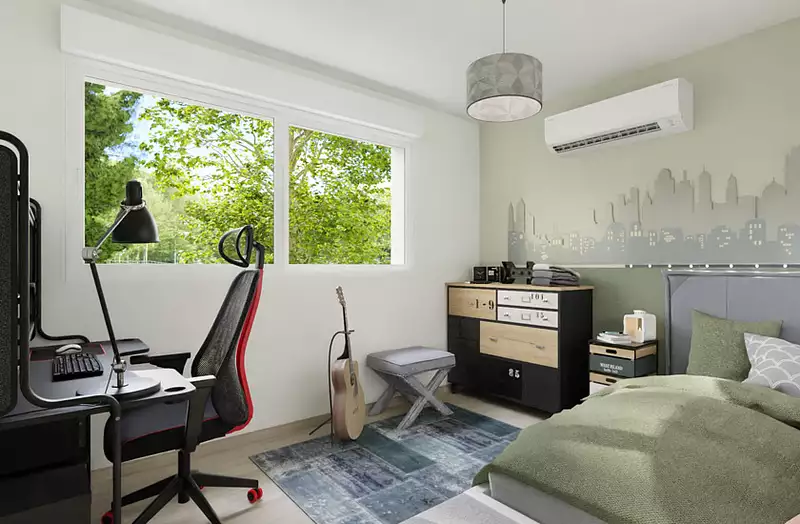 Pour votre confort, le modèle Opale est muni d'une climatisation réversible*. Associée à la haute qualité de l'isolation, l'ensemble garanti un confort en toute saison. La box domotique permet de piloter les équipements connectés, notamment les volets roulants motorisés. La porte de garage sectionnelle est également isolée, motorisée et pilotable depuis l'application fournie.
