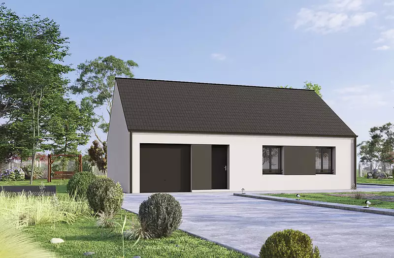 Cette maison de plain-pied, construite sur vide sanitaire, propose une surface habitable de 73 m² et comprend 3 chambres, un séjour cuisine de plus de 38 m², une salle d'eau et un garage intégré.
