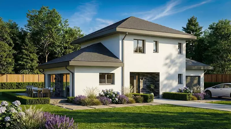 Les options les plus demandées par nos clients sont également disponibles : conduit de fumée, ajout d’une porte de service, et crépis coloré. De plus, cette maison neuve est basse consommation et conforme à la RE2020, garantissant ainsi des performances énergétiques optimales et un respect des normes environnementales actuelles.