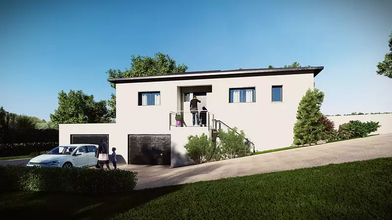 > Visuel d'illustration. Le modèle est totalement adaptable à vos envies et besoins et personnalisable grâce à de nombreuses options de finition. Nous consulter pour plus d’informations. Le prix affiché comprend le coût du terrain et de la construction hors frais de notaire et taxes. Les annonces de terrains constructibles sont sélectionnées auprès de nos partenaires fonciers selon disponibilités et autorisation de publicité en vue de construire une maison neuve avec un Contrat de Construction de Maison Individuelle dans le cadre de la loi du 19/12/1990. Ces derniers sont soit des professionnels dûment habilités à la transaction immobilière, soit des particuliers. Les terrains sélectionnés sont disponibles à la date de la première parution de l’annonce. En aucun cas Maisons ARLOGIS ou ses collaborateurs ne sont propriétaires des terrains, ne jouent un rôle d’intermédiation ou de négociation sur la transaction et ne participent à la vente. Prix indiqués par nos partenaires fonciers.