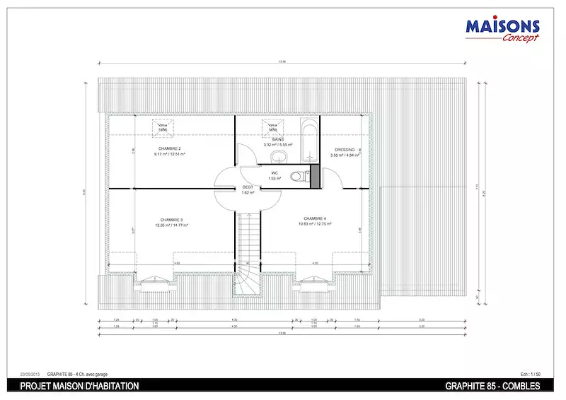 La ""Graphite"" est composée de 4 chambres réparties intelligemment pour garantir l'intimité de chacun, et de 4 pièces conçues pour maximiser l'espace de vie commun. La dalle de l'étage en béton assure une solidité et une isolation phonique de qualité, tandis que les combles aménagés offrent un espace supplémentaire, idéal pour une salle de jeux, un bureau ou une chambre d'amis.