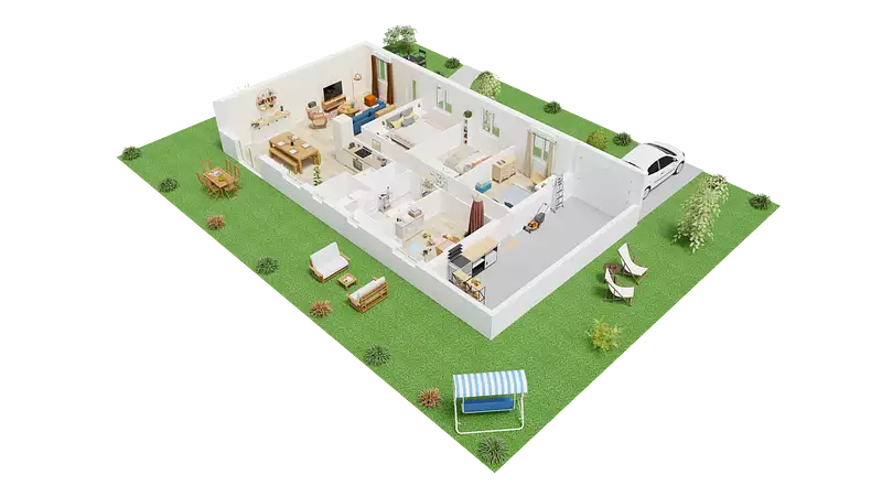 Habitat concept vous propose ce pavillon répondant aux normes RE 2020. Il fait 95 m² habitable et comprend une cuisine ouverte sur un grand séjour, 4 chambres, 1 salle de bains, un wc , un cellier et un garage