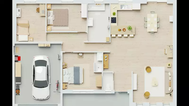 Ce modèle se déploie sur une surface généreuse de 115 m², intelligemment répartie en 4 pièces, dont 3 chambres confortables. La suite parentale, un véritable havre de paix, promet intimité et tranquillité. Le garage intégré offre non seulement un espace de stationnement sécurisé mais aussi un espace de rangement supplémentaire ou la possibilité d'aménager un atelier pour les bricoleurs.