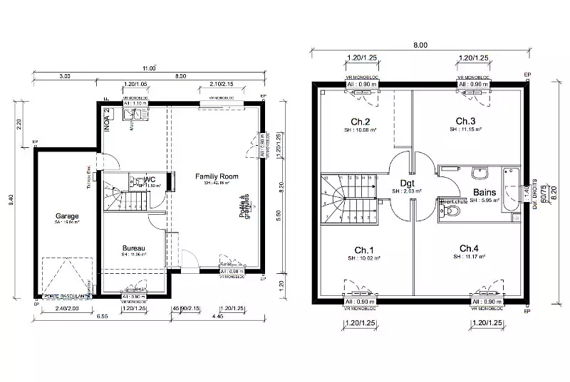 La partie nuit est répartie en 4 chambres supplémentaire entre 10 et 11m² ainsi qu’une salle de bain avec baignoire ou douche au choix, un lavabo et un WC séparé.