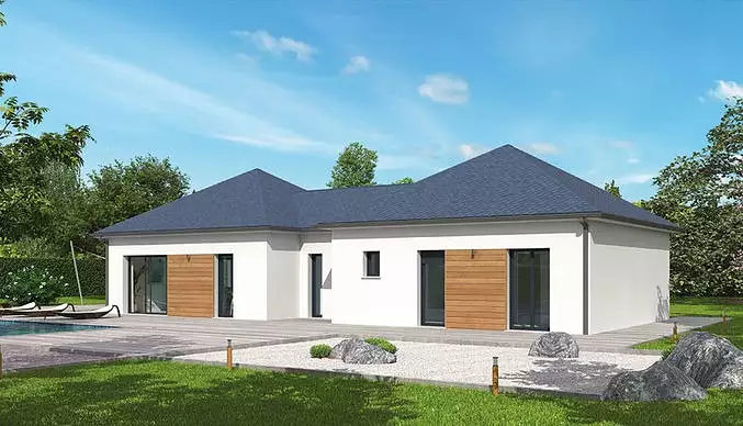 Sur un terrain de 594 m², découvrez le modèle Nativie, une maison de plain-pied aussi fonctionnelle qu'esthétique, avec ses 4 chambres, son poêle à granulés et son organisation en 3 volumes bien distincts.