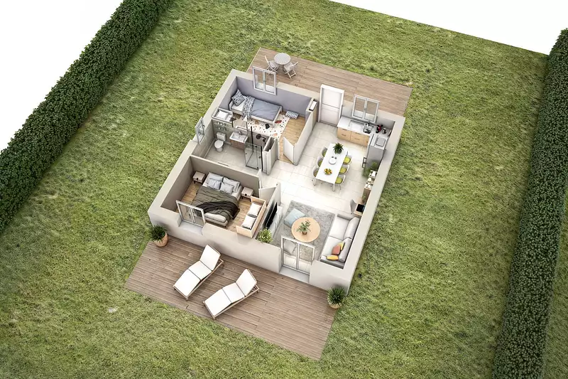 La PERLE 3 propose deux chambres confortables, adaptées aussi bien à une vie de couple, qu’à une petite famille ou à un projet de télétravail. Une salle de bains moderne complète ce cocon aux lignes simples et efficaces.