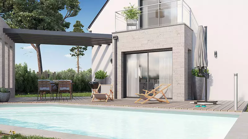 Une maison qui a tout pour plaire !. Laissez-vous séduire par cette maison à l’architecture élégante, où chaque espace est conçu pour répondre à vos envies de lumière, de confort et de modernité. Son espace de vie généreux, baigné de lumière naturelle grâce à de larges ouvertures, invite à la convivialité et au bien-être. L’étage réserve un univers cosy avec deux grandes chambres, un dressing spacieux et une salle d’eau moderne, créant un véritable cocon d’intimité. Pratique et fonctionnelle, cette maison dispose aussi d’un garage intégré et d’un cellier pour un quotidien simplifié. Un cadre de vie unique, où élégance et praticité se rencontrent. Contactez-nous pour en savoir plus !. Pour un confort optimal et conforme à la RE2025, cette maison dispose d’une PAC avec plancher chauffant au rez-de-chaussée, radiateurs à l’étage et volets roulants électriques. À noter : Le prix indiqué exclut les revêtements de sol des chambres, la cuisine aménagée, la peinture, la décoration, les raccordements, les frais de notaire et l’assurance dommages-ouvrage. (Piscine non contractuelle, non comprise dans le prix).
