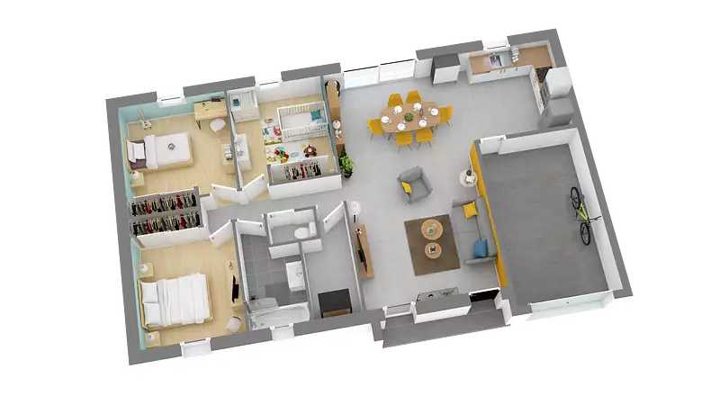 Vous serez séduits par cette maison contemporaine qui se distingue par son porche en façade et ses enduits bi-ton personnalisable. Elle vous accueille dans un très bel espace de vie de plus de 42 m² très lumineux grâce à ses nombreuses ouvertures. La cuisine ouverte est très fonctionnelle puisqu’à la fois ouverte sur le séjour et accolée au cellier. L’espace nuit est composé de trois chambres avec tous les rangements nécessaires ainsi que d’une salle de bain et des wc séparés. Le plus de cette maison est sans nul doute son garage intégré. Pour vous assurer un confort de vie et conformément à la RE2025, nous avons choisi un mode de chauffage par PAC + plancher chauffant, volets roulants électriques. Prix hors fourniture et pose : des appareils sanitaires (sauf système de chauffage et d'eau chaude sanitaire), du carrelage et de la faïence, des revêtements de sol dans les chambres. Hors décoration et aménagement intérieur et peinture. Hors raccordements, frais de notaire et dommage ouvrage.