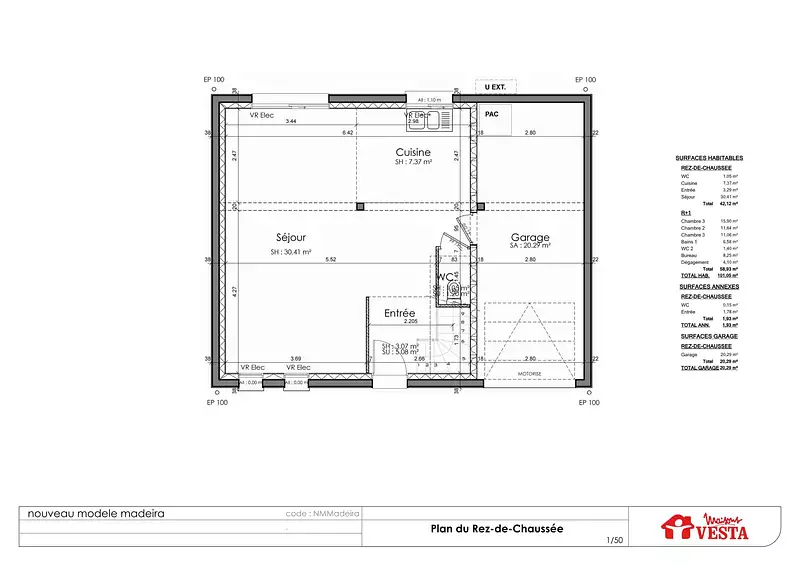 Le rez-de-chaussée inclut également des toilettes pratiques près de l'entrée et un grand garage intégré de 20,29 m², offrant à la fois un abri sécurisé pour votre véhicule et un espace de rangement supplémentaire.
