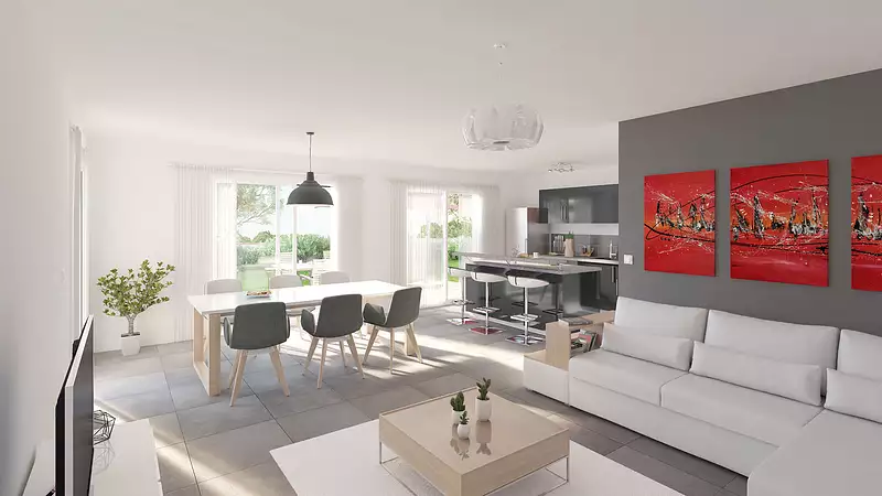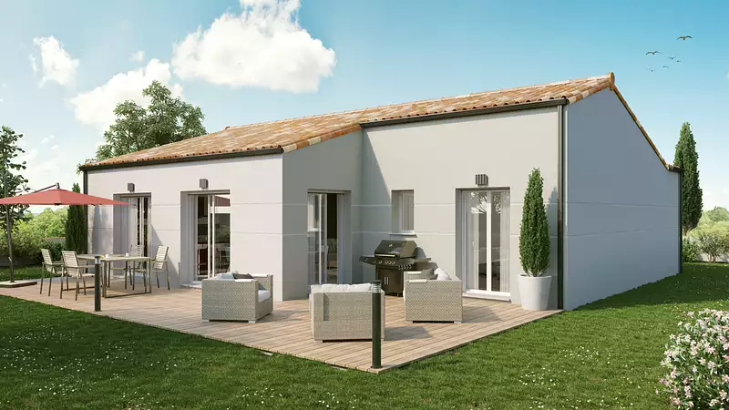 Avec son architecture en L, cette maison de plain-pied séduit par son style moderne et sa disposition astucieuse. La pièce de vie baignée de lumière s’ouvre vers l’extérieur, tandis que les 3 chambres assurent confort et intimité au quotidien. Le garage intégré et le cellier attenant facilitent l’organisation tout en préservant l’esthétique des volumes. Un modèle fonctionnel, chaleureux et personnalisable, pensé pour une vie douce et bien organisée. Pour un confort optimal et conforme à la RE2025, cette maison dispose d’une PAC avec plancher chauffant et volets roulants électriques. À noter : Le prix indiqué exclut les revêtements de sol des chambres, la cuisine aménagée, la peinture, la décoration, les frais de notaire et l’assurance dommages ouvrage.