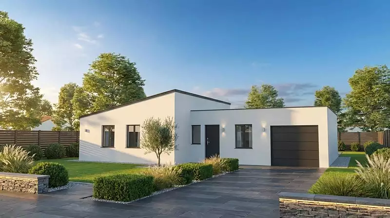 La toiture plate et les larges ouvertures apportent une luminosité exceptionnelle à l’ensemble de la maison. Le garage intégré et les volets roulants motorisés ajoutent une touche de confort et de modernité.