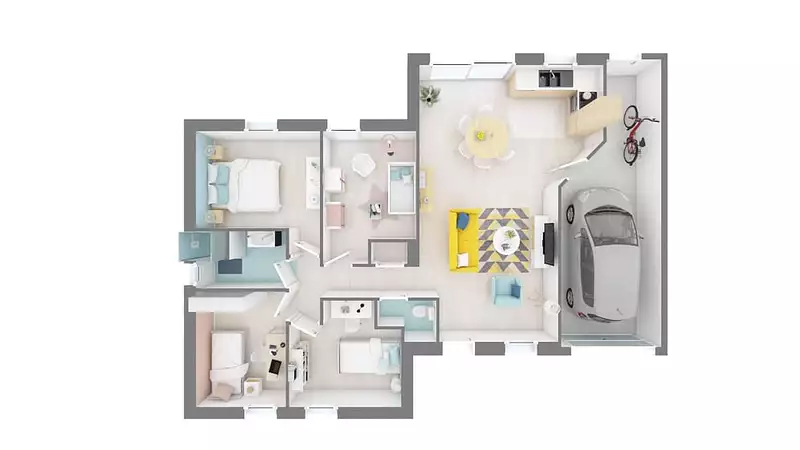Le modèle Dompierrum, proposé par Maisons Privat, constructeur centenaire avec les meilleurs avis clients de la région, est une maison de plain-pied aussi simple que stylée. Avec une surface de 90 m², cette demeure se compose de quatre chambres et de quatre pièces, offrant ainsi une organisation pratique et fonctionnelle de l’intérieur.