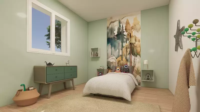 Son intérieur inclut deux chambres, une cuisine ouverte sur une pièce de vie lumineuse et une salle de bains.