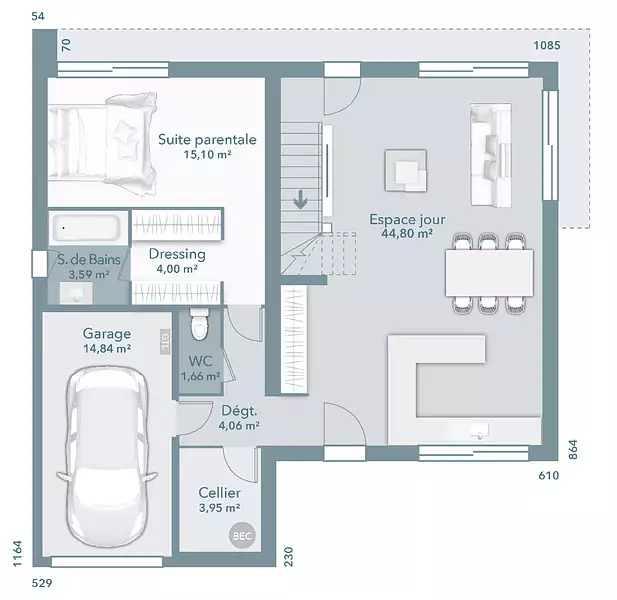 Elle dispose de 4 chambres dont la suite parentale au rdc avec sa salle d'eau, une salle de bain et 2 wc séparés, spacieux espace cuisine et séjour ouvert, un cellier et le garage accolé.
