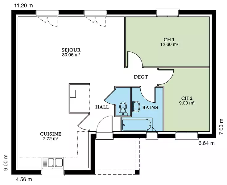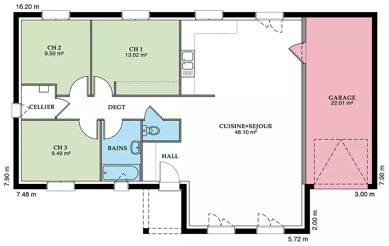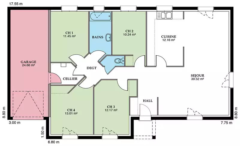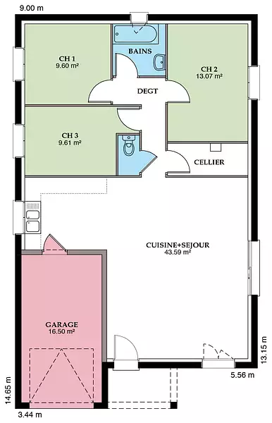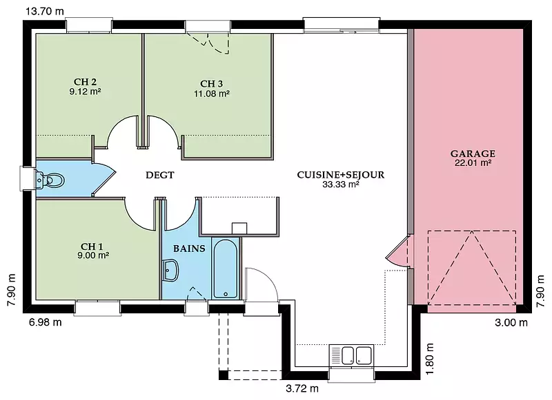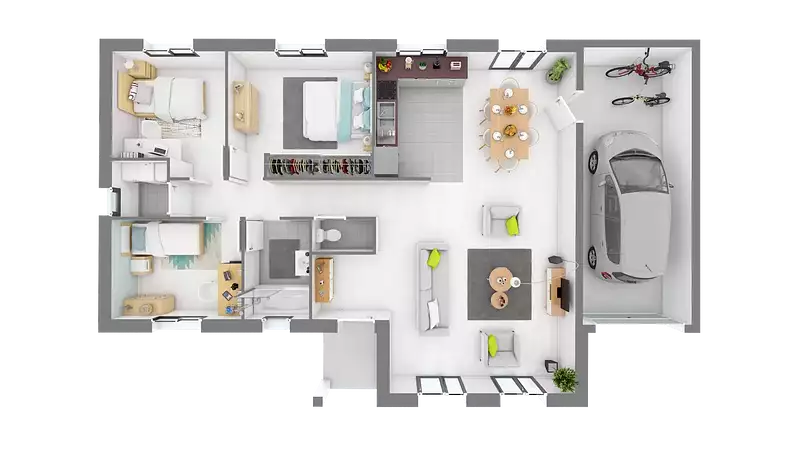 Cette maison de plain-pied se compose de 4 pièces lumineuses, incluant 3 chambres confortables, conçues pour s'adapter à toutes les configurations familiales. Que vous soyez un couple ou une famille en croissance, la Hilairoise répond à vos attentes en matière d'espace et de confort.