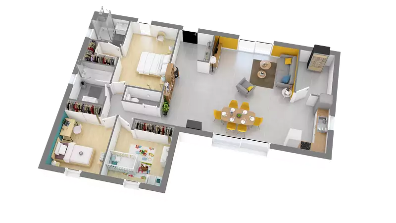 Cette maison de plain-pied en L, fonctionnelle et spacieuse vous propose un bel espace de vie lumineux et traversant. Sa cuisine est ouverte sur le séjour et a un accès direct au cellier. Son espace nuit est composé de trois belles chambres dont une suite parentale avec dressing et salle de bain privative, une deuxième salle de bains équipé ainsi que des wc séparés. Pour vous assurer un confort de vie et conformément à la RE2025, nous avons choisi un mode de chauffage par PAC + plancher chauffant, volets roulants électriques. Prix hors fourniture et pose : des appareils sanitaires (sauf système de chauffage et d'eau chaude sanitaire), du carrelage et de la faïence, des revêtements de sol dans les chambres. Hors décoration et aménagement intérieur et peinture. Hors raccordements, frais de notaire et dommage ouvrage.