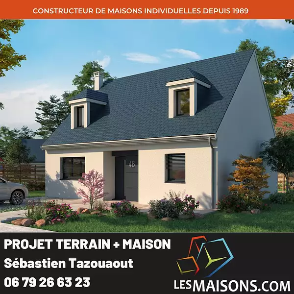 Prix indiqué hors frais annexes, aménagements extérieurs et finitions intérieures. Ce prix n'inclut pas les frais de notaire sur le terrain. Terrain proposé par un partenaire foncier, sous réserve de disponibilité. Projet réalisé dans le cadre d'un Contrat de Construction de Maison Individuelle (CCMI). Visuel non contractuel.
