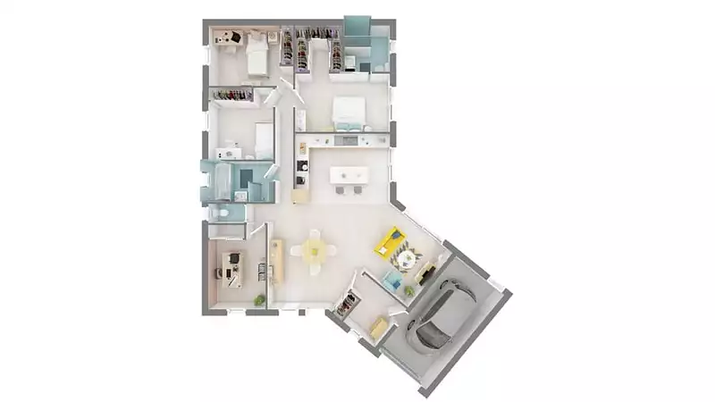 Notre modèle Aria est une superbe maison avec un plan en V, offrant une surface de 80 m². Elle se compose de 4 pièces, dont une grande pièce de vie avec cuisine ouverte, idéale pour des moments conviviaux en famille ou entre amis. L'espace nuit comprend 3 chambres, parfait pour accueillir une famille.