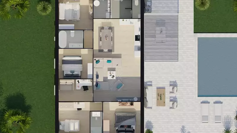 Proposition de villa traditionnelle de plain-pied comprenant 4 chambres dont une suite parentale, une salle de bain, un bureau, WC séparés et cellier, séjour avec cuisine ouverte.
