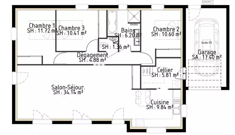 Proposée par MAISONS PARTOUT – 5 pièces - 3 chambres - terrain 569 m²