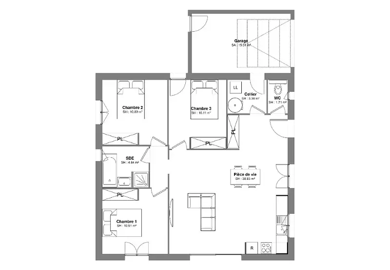 . (Plan personnalisable). Tous nos ouvrages sont réalisés sur-mesure en fonction de vos attentes et de nos échanges avec vous ainsi que dans le respect de la règlementation RE 2020. Ce projet comporte les garanties suivantes: Contrat de construction CCMI. Dommage/Ouvrage. RC Garantie décennale. Parfaite achèvement. Etude de sol G2. Prix et délais convenu. Garantie de livraison. Garantie financière Pour votre tranquillité nous nous occupons de toutes les formalités administratives.