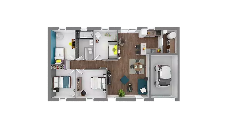 La My First 91 se distingue par son agencement parfaitement optimisé. Elle dispose de quatre chambres spacieuses, chacune de plus de 10 m², offrant ainsi un espace de vie confortable pour chaque membre de la famille. La maison comprend également une grande pièce de vie traversante et lumineuse avec une cuisine ouverte, un cellier attenant, une salle de bain avec baignoire et des WC séparés.