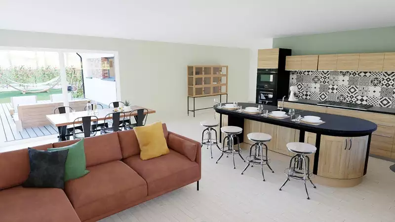 Elle se compose d'une belle pièce de vie de 42m2 très lumineuse grâce à sa grande baie coulissante, cuisine ouverte.