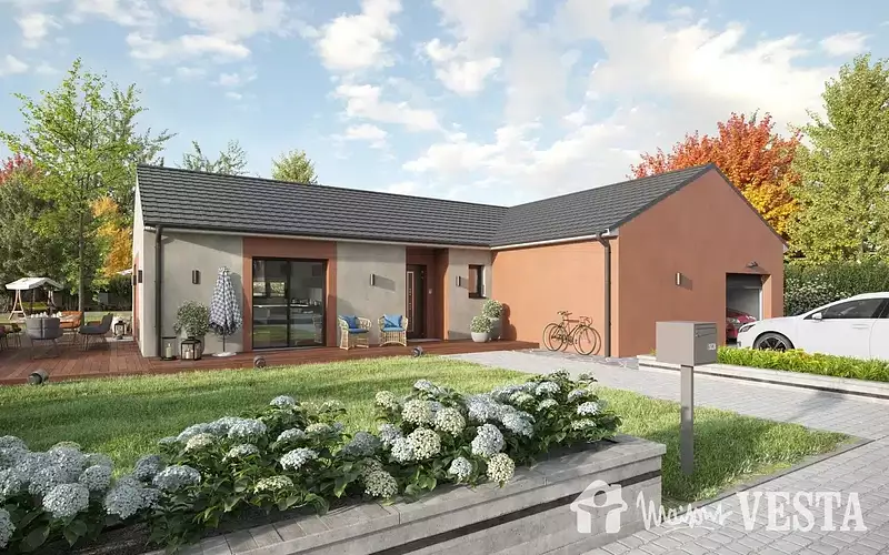 Le modèle MALAGA se distingue par son architecture en L avec une avancée à l'avant, offrant ainsi une discrétion appréciable par rapport à la rue et un espace extérieur plus intime. Le porche d'entrée vous accueille, ajoutant une touche d'élégance à l'ensemble. À l'intérieur, la pièce de vie spacieuse de plus de 40 m² baigne dans la lumière naturelle grâce à ses nombreuses ouvertures sur trois murs, créant un espace de vie chaleureux et accueillant.