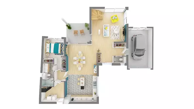 À l’extérieur, les détails sympathiques ne manquent pas. Un préau et d’esthétiques parements équipent les façades. Le mur de l’entrée en renfoncement est ornementé de briques. Le solarium, quant à lui, offre un espace couvert pour une petite terrasse. Quelle que soit la saison, cette maison permettra de disposer de beaucoup d’espace, dedans comme dehors?!