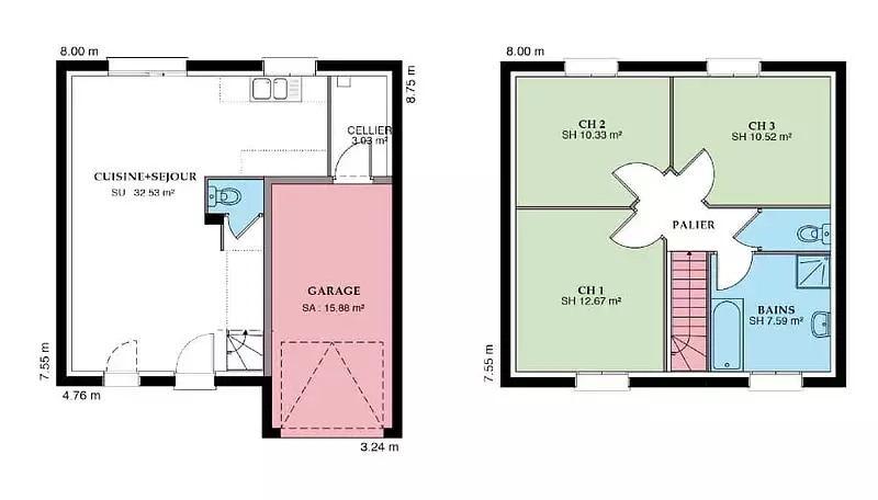 Les options les plus demandées par nos clients sont disponibles pour cette maison : enduit bi-ton pour une façade personnalisable, domotique pour un confort de vie optimal, et volets roulants motorisés pour plus de praticité.
