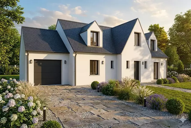 Nous vous proposons cette maison neuve, baptisée ""Graphite"", un modèle à étage qui combine habilement espace et élégance. Avec une surface habitable de 99 m², cette maison est conçue pour répondre aux besoins de confort et de fonctionnalité de ses résidents. Elle se distingue par son architecture soignée, offrant une avancée de façade avec un pignon qui lui confère une originalité remarquable tout en préservant un style traditionnel.