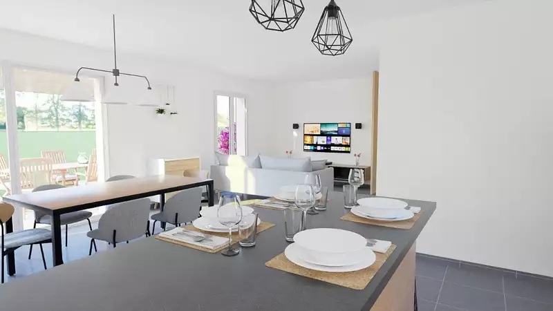 Une grande pièce de vie avec sa cuisine donnant sur les extérieures pour profiter au maximum du jardin.