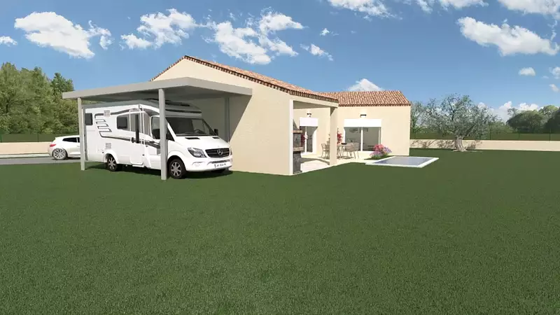 Un garage accolé de 27 m² avec une partie auvent de 14 m², une terrasse de 21 m² carrelée et le porche d'entrée est compris dans les options proposées. Projet entièrement personnalisable ! On peut y ajouter également un carport en option.