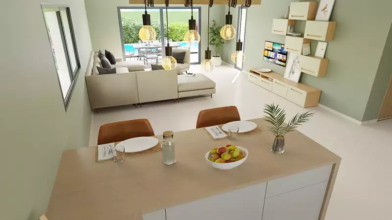 Proche de Perpignan - Maison neuve 4 pièces en vente à Ponteilla de 110 m² et de 537 m² de terrain en 4 faces exposé sud. Elle offre trois chambres dont une suite au RDC et un séjour de 50m².