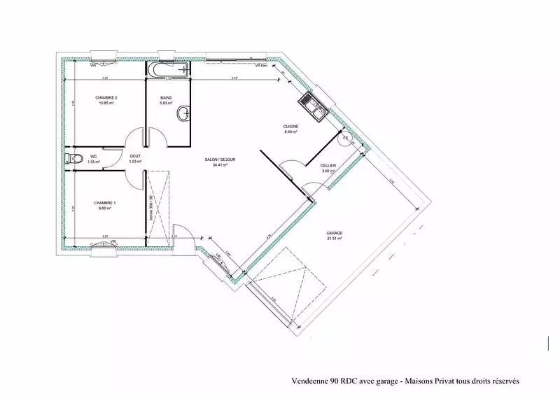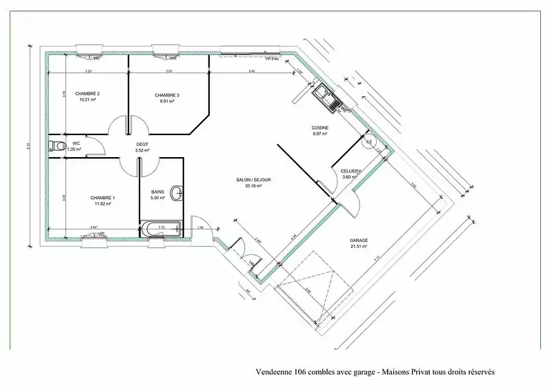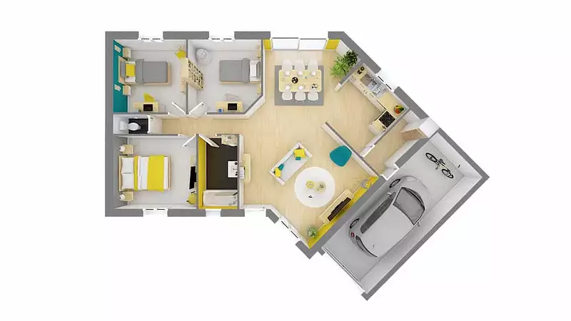 La Vendéenne est une maison familiale chaleureuse et bien pensée. Elle dispose de trois confortables chambres et de quatre pièces au total, incluant un vaste salon-séjour-cuisine agrémenté d’un cellier. Son plan en V unique permet à la façade de profiter pleinement de l'ensoleillement tout au long de la journée, garantissant une luminosité optimale et des économies d'énergie.