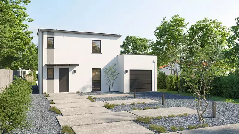 D’une surface de 80 m², la Sorinum se distingue par son design moderne et ses lignes épurées. Elle est idéale pour les terrains étroits grâce à sa forme compacte et son toit-terrasse sur le garage. Cette maison basse consommation est conforme à la RE2020, garantissant ainsi un confort thermique optimal et des économies d'énergie significatives.