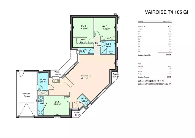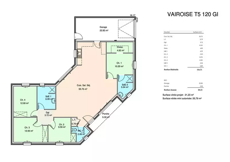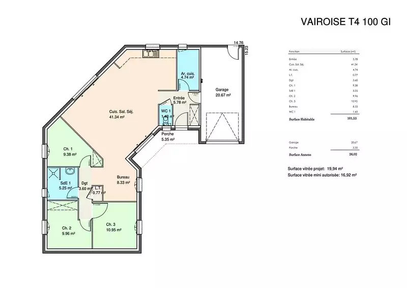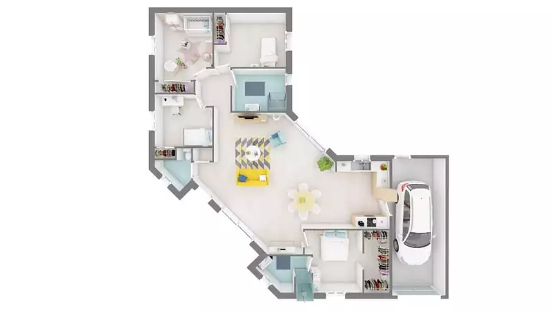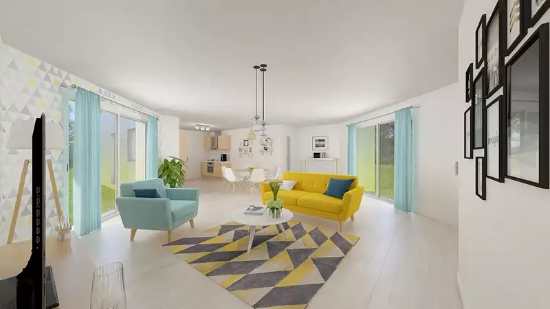 Sa forme autorise une organisation intérieure esthétique et originale, avec juste ce qu’il faut d’asymétrie. Cette habitation dispose d'une surface habitable de 100 m². L'atout de cette construction est certainement la pièce de vie traversante de plus de 50 m². Espace et lumière sont au rendez-vous. Nos plans sont proposés avec 3 chambres, mais l'ajout d'un bureau est une option totalement envisageable. Le modèle Vairoise, comme tous nos modèles, est entièrement personnalisable. Ainsi, l’une des chambres peut être équipée d'un dressing et d'une salle d’eau privative. Ce modèle dispose également d’un grand garage.