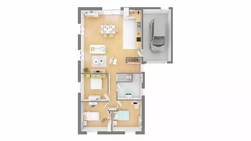 Vous apprécierez également la porte communicante avec le garage intégré, qui vous évitera d'affronter les éléments lorsque vous vous y rendrez. Le plan en L de cette maison est personnalisable et très apprécié, offrant une flexibilité d'aménagement selon vos besoins. Vous avez également le choix entre un toit à 2 pans ou à 4 pans, selon vos préférences esthétiques.